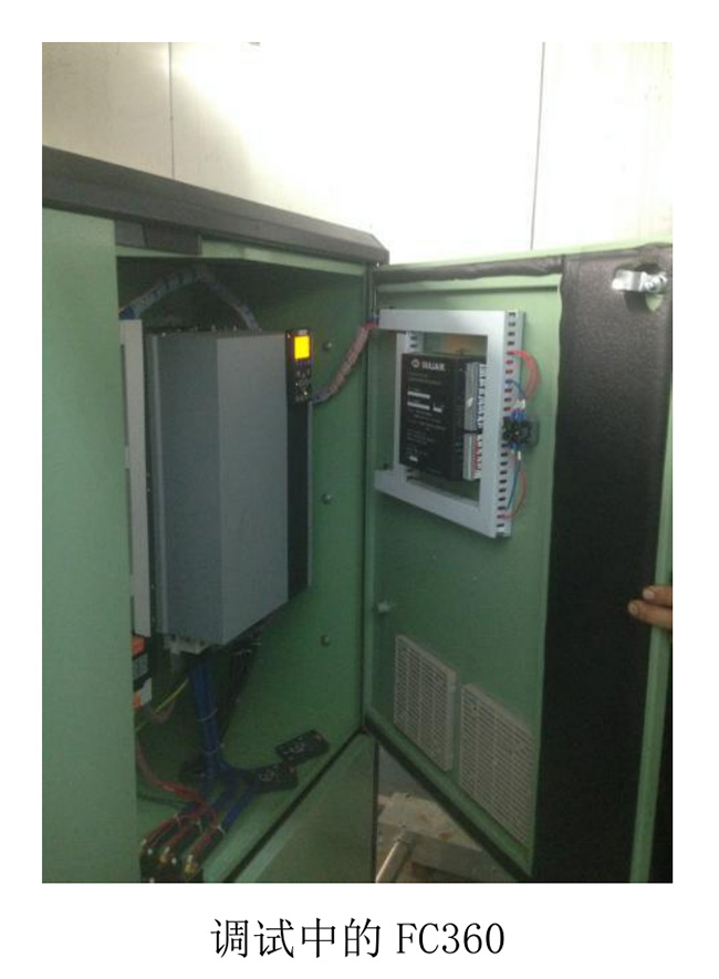 以上兩張圖片是我司在佛山某空壓機(jī)應(yīng)用現(xiàn)場(chǎng)所拍,我司的技術(shù)工程師正在調(diào)試FC360變頻器。空壓機(jī)變頻調(diào)速控制原理是電動(dòng)機(jī)拖動(dòng)空氣壓縮機(jī)旋轉(zhuǎn),使之產(chǎn)生壓縮空氣,并存儲(chǔ)于儲(chǔ)氣罐中。儲(chǔ)氣罐中空氣壓力的大小取決于空氣壓縮機(jī)產(chǎn)生壓縮空氣的能力(本系統(tǒng)中即取決于電動(dòng)機(jī)的轉(zhuǎn)速)和用戶用氣量之間的平衡狀況,為了保證供氣質(zhì)量,要求儲(chǔ)氣罐空氣壓力穩(wěn)定在某一數(shù)值上。儲(chǔ)氣罐內(nèi)的壓力為被控量,壓力變送器將儲(chǔ)氣罐的壓力變換成電信號(hào)送給變頻器PID單元,與壓力給定值進(jìn)行比較,PID能單元根據(jù)比較所得偏差的大小和方向按預(yù)定的 PID 運(yùn)算規(guī)律運(yùn)算后產(chǎn)生控制信號(hào)改變變頻器的輸出,從而改變電動(dòng)機(jī)的轉(zhuǎn)速,使儲(chǔ)氣罐內(nèi)的實(shí)際壓力始終維持在給定值上。