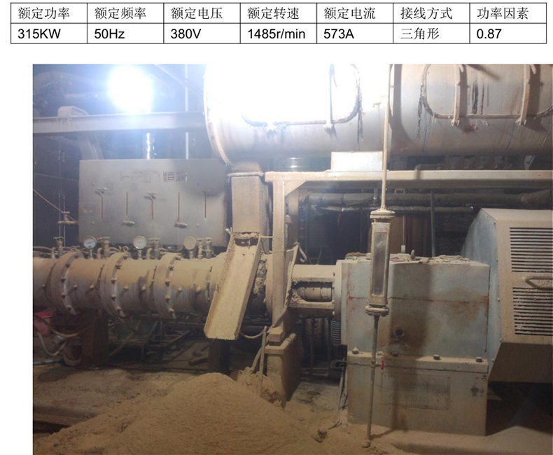 2、 、 改造設備概述: :客戶要求改造的設備為膨化機,達315KW 功率(實際銘牌數(shù)據(jù)如下表1)。膨化機工作原理為:利用膨化機的不等距非標準螺旋系統(tǒng)的擠壓推進,物料中的氣體被排出,并迅速被物料填充,物料受剪切力作用而產生回流,使機膛內的壓力增大,隨著摞旋與機膛間的磨擦使物料充分混合、擠壓、加熱、膠合、糊化而產生組織變化,原有的結構受到破壞,同時機械能通過物料在膛內的磨擦作用而轉化為熱能,使物料成為具有流動性質的膠凝狀態(tài),物料被擠壓到出口時壓力由高壓瞬間變?yōu)槌?,由高溫瞬間變?yōu)槌?,造成水分迅速地從組織結構中蒸發(fā)出來,使其內部形成無數(shù)微孔結構,再通過切割裝置,切割冷卻即膨化成形。