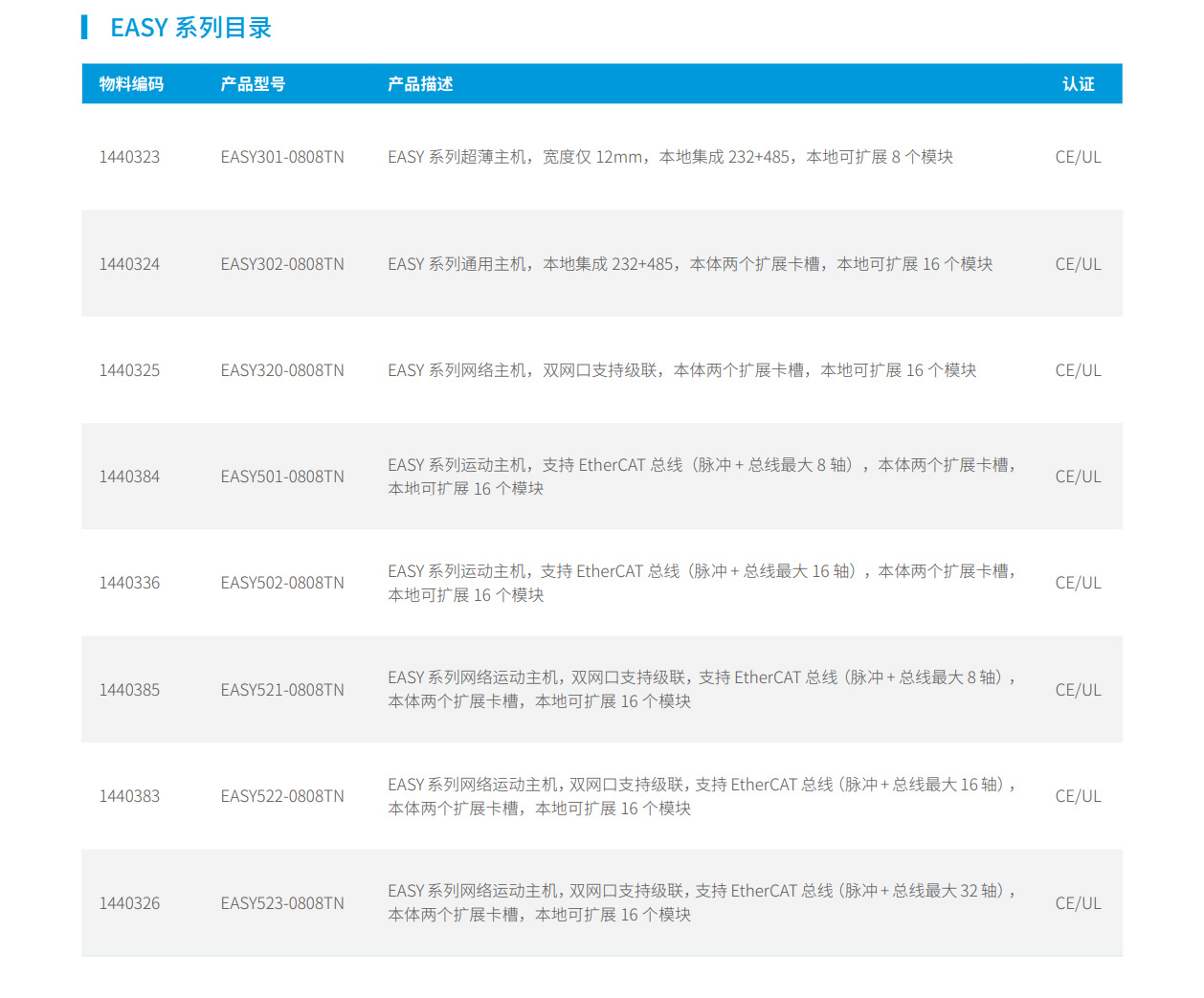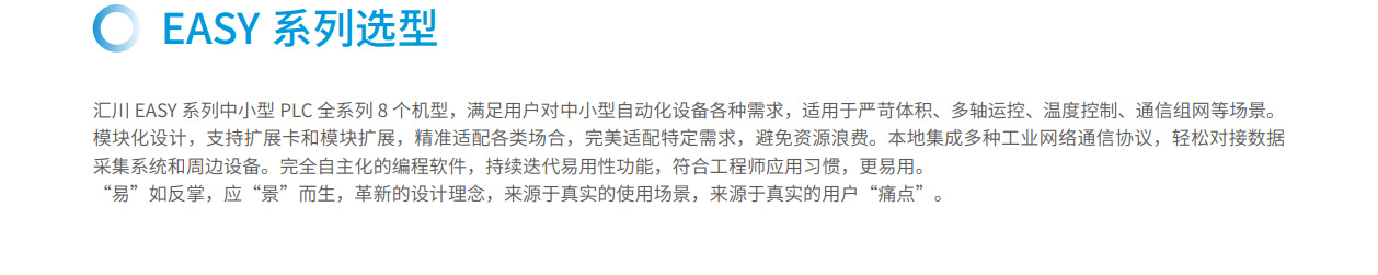 匯川EASY系列全場(chǎng)景緊湊型中小型控制器全系列8個(gè)機(jī)型,滿足用戶對(duì)中小型自動(dòng)化設(shè)備各種需求,適用于嚴(yán)苛體積、多軸運(yùn)控、溫度控制、通信組網(wǎng)等場(chǎng)景。機(jī)身模塊化設(shè)計(jì),支持?jǐn)U展卡和模塊擴(kuò)展,精準(zhǔn)適配各類場(chǎng)合,完美適配特定需求,避免資源浪費(fèi)。本地集成多種工業(yè)網(wǎng)絡(luò)通信協(xié)議,輕松對(duì)接數(shù)據(jù)采集系統(tǒng)和周邊設(shè)備。完全自主化的編程軟件,持續(xù)迭代易用性功能,符合工程師應(yīng)用習(xí)慣,更易用。 “易”如反掌,應(yīng)“景”而生,革新的設(shè)計(jì)理念,來源于真實(shí)的使用場(chǎng)景,來源于真實(shí)的用戶“痛點(diǎn)”。
